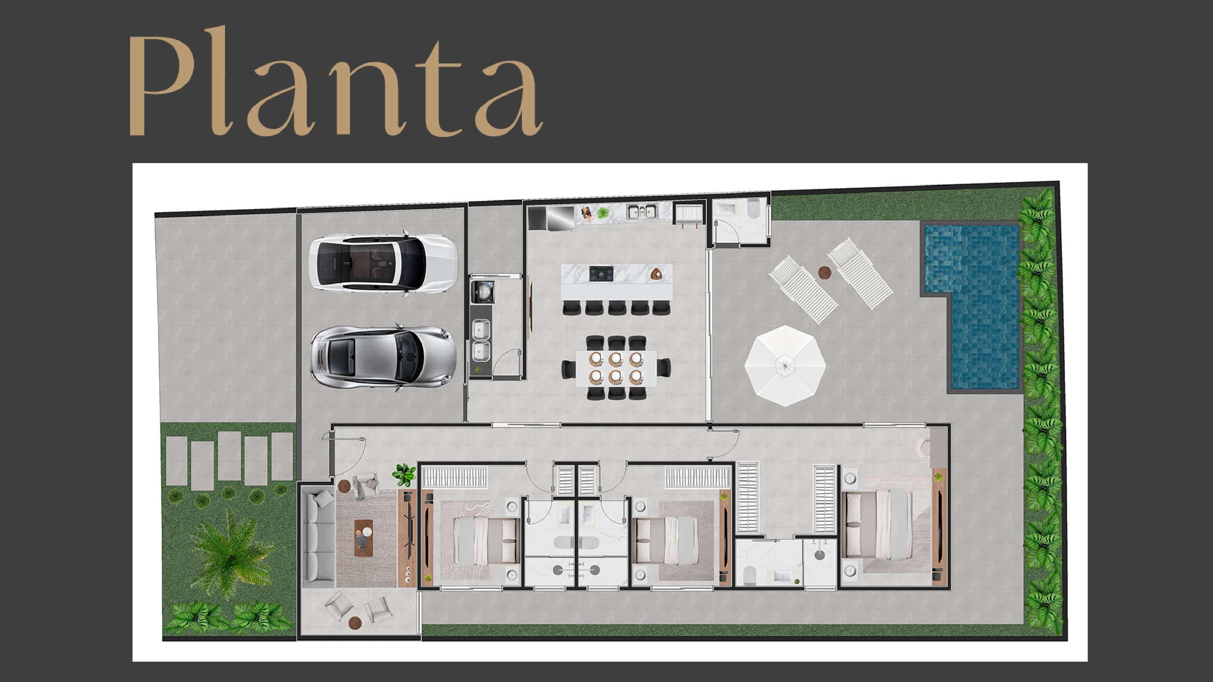 Área íntima com 1 suíte master e 2 suítes, 7 modelos de fachada e 4 tipos de planta, permitindo que o cliente personalize como quiser sua casa.