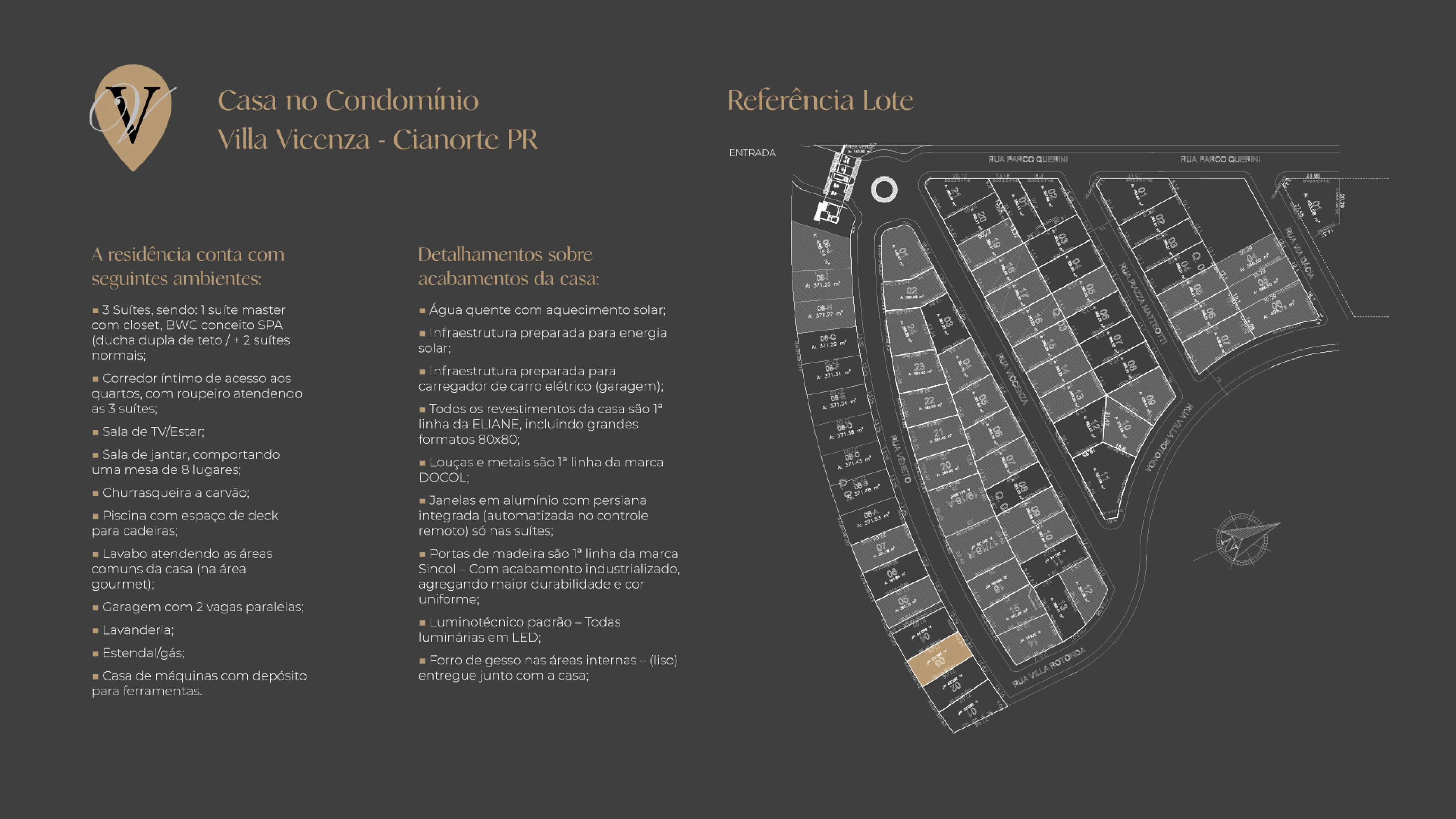 Esta casa fica situada no condomínio Villa Viccenza, em uma região valorizada de condominios, á 900mts da região central de Cianorte, próximo de escolas e comércio.